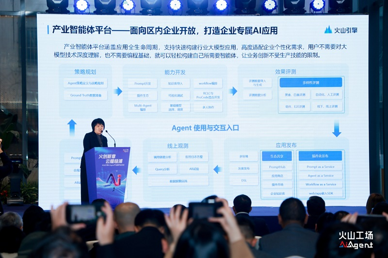 现场,薛侃、周海鹰、裘薇、赵文婕,以及抖音集团政务合作副总经理郑汉星共同上台揭幕,正式宣布火山工场AI Agent产业园开业,标志着园区迈入全面运营、赋能产业生态的崭新阶段。